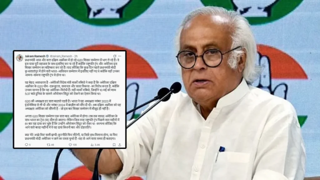 कांग्रेस ने शुक्रवार को दावा किया कि प्रधानमंत्री नरेन्द्र मोदी दक्षिण अफ्रीका में जी 20 शिखर सम्मेलन में सहजता से भाग ले रहे हैं क्योंकि अमेरिकी राष्ट्रपति डोनाल्ड ट्रंप इस आयोजन का बहिष्कार कर रहे हैं। पार्टी महासचिव जयराम रमेश ने तंज करते हुए कहा कि अगला जी 20 सम्मेलन अमेरिका में आयोजित होगा और तब देखना होगा कि प्रधानमंत्री क्या रास्ता चुनते हैं।प्रधानमंत्री मोदी शुक्रवार को तीन दिवसीय यात्रा पर दक्षिण अफ्रीका रवाना हुए, जहां वह जोहानिसबर्ग में होने वाले जी20 शिखर सम्मेलन में हिस्सा लेंगे। रावाना होने से पहले उन्होंने कहा कि वह ‘वसुधैव कुटुंबकम’ तथा ‘एक पृथ्वी, एक परिवार और एक भविष्य’ की भावना के अनुरूप भारत का दृष्टिकोण प्रस्तुत करेंगे। रमेश ने एक्स पर पोस्ट किया, “प्रधानमंत्री आज और कल दक्षिण अफ्रीका में हो रहे जी 20 शिखर सम्मेलन में भाग ले रहे हैं। वह इस यात्रा को पूरी सहजता के साथ इसलिए कर पा रहे हैं क्योंकि ट्रंप और अमेरिका इस शिखर सम्मेलन का बहिष्कार कर रहे हैं।” उन्होंने दावा किया, “याद कीजिए कि कुछ दिन पहले प्रधानमंत्री कुआलालंपुर में होने वाले भारत-आसियान सम्मेलन में इसलिए नहीं गए थे क्योंकि वहां उनका आमना-सामना अमेरिकी राष्ट्रपति ट्रंप से होना था।”