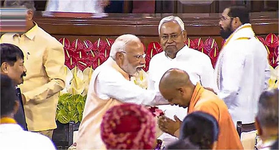 नेशनल डेस्क: प्रधानमंत्री नरेंद्र मोदी ने पुरानी संसद के केंद्रीय कक्ष में राष्ट्रीय जनतांत्रिक गठबंधन (एनडीए) सांसदों की बैठक में उत्तर प्रदेश के मुख्यमंत्री योगी आदित्यनाथ की पीठ थपथपाई और भाजपा के विरोधियों को ‘बड़ा संदेश’ दिया। प्रधानमंत्री नरेंद्र मोदी को भगवा ब्लॉक के नेता के रूप में चुने जाने के बाद उनके भाषण के बाद एनडीए सांसदों, भाजपा मुख्यमंत्रियों, नेताओं द्वारा स्वागत किए जाने के बाद उस क्षण को कैमरे में कैद कर लिया गया।